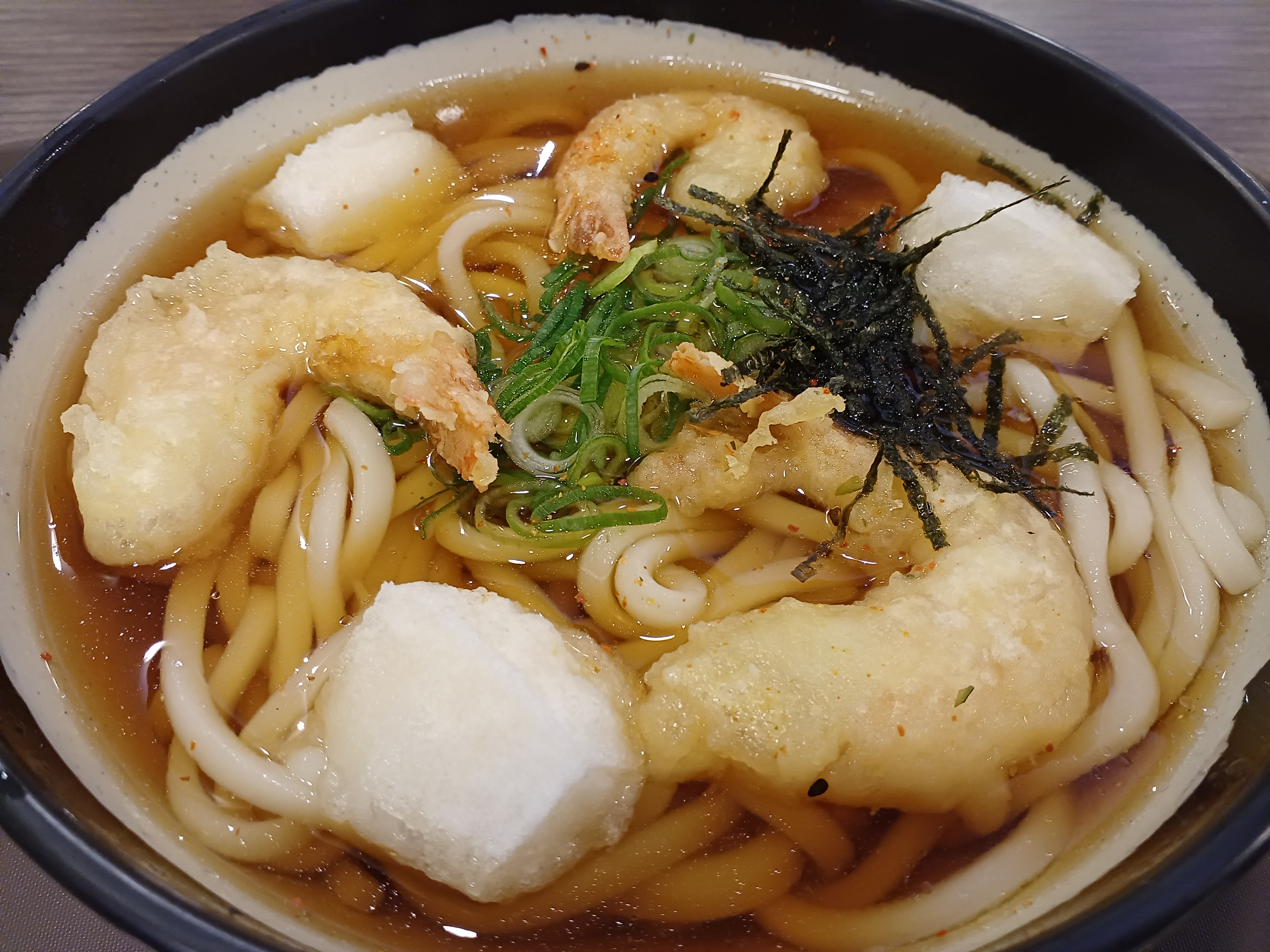「東名足柄サービスエリア」の天ぷら力うどんを朝食にセレクト♪応援前の腹ごしらえに最適でした。